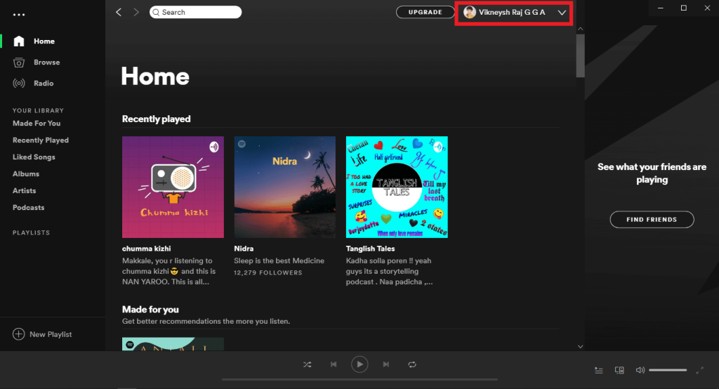 - Öffnen Sie die Spotify-Anwendung und klicken Sie auf Ihren Namen im oberen Bereich.