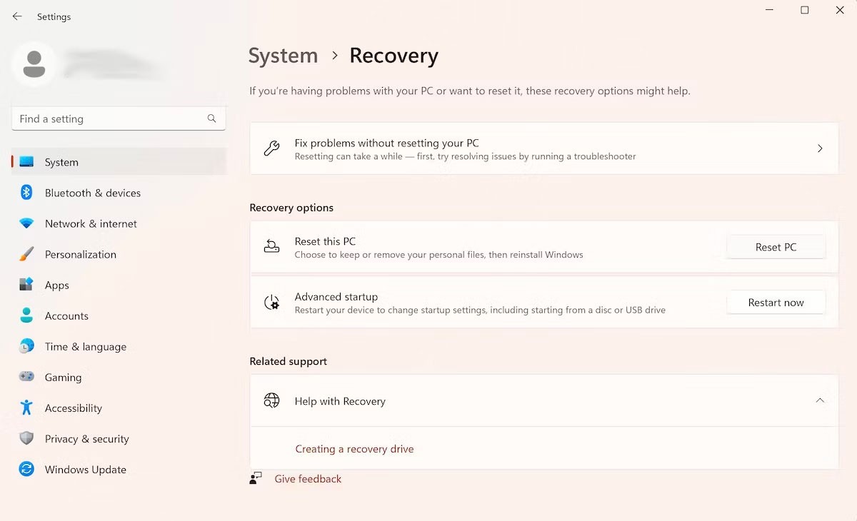 Wählen Sie nun die Schaltfläche System > Wiederherstellung .