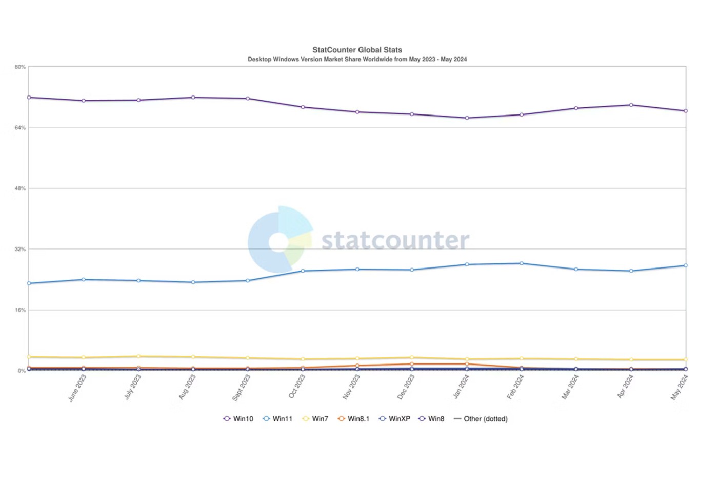 Laut StatCounter machen Windows-10-Nutzer im Mai 2024 immer noch über 68 % des Marktes aus, während Windows 11 nur 27 % ausmacht. Aufgrund der enormen Reichweite des Betriebssystems verpassen Millionen von Nutzern Copilot.