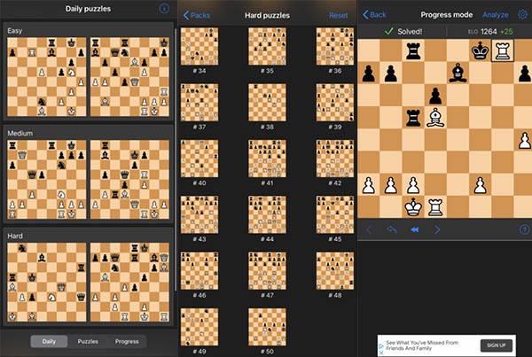 Der Abschnitt „Fortschritt“ generiert ein Rätsel, das Ihrem aktuellen Fähigkeitsniveau entspricht – Siege erhöhen Ihre Elo-Bewertung, Niederlagen verringern sie.