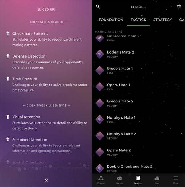 Die Lektionen sind in verschiedene Kategorien unterteilt, beispielsweise Schlusszüge oder Eröffnungszüge.