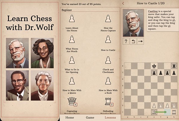 „Learn Chess With Doctor Wolf“ ist eine großartige App für Anfänger und fortgeschrittene Spieler, für fortgeschrittene Spieler ist es praktisch nichts weiter als ein Auffrischungskurs.