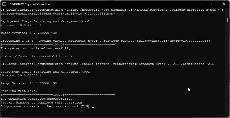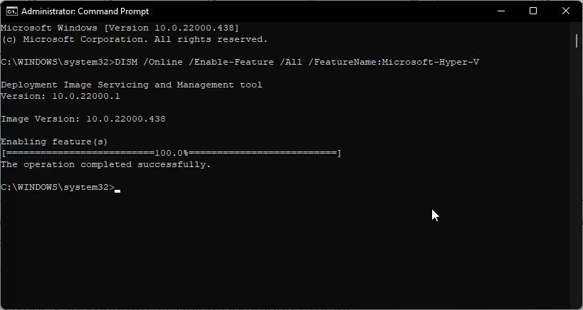 3. Der obige Befehl verwendet das Tool Deployment Imaging Service and Management (DISM), um Microsoft Hyper-V und die erforderlichen Abhängigkeiten auf Ihrem Windows-Computer zu aktivieren. Die Meldung „Vorgang erfolgreich abgeschlossen“ wird angezeigt, was bedeutet, dass Sie Hyper-V erfolgreich aktiviert haben.