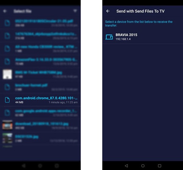 Wählen Sie die heruntergeladene APK-Datei aus und klicken Sie auf den Namen des Fernsehers auf Ihrem Telefon, um Daten zu übertragen.