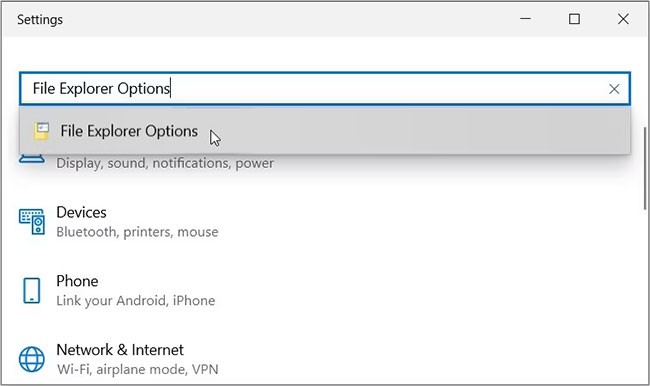 Geben Sie „Datei-Explorer-Optionen“ in das Suchfeld ein und wählen Sie dann die entsprechende Option aus.