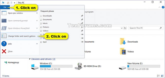 2. Klicken Sie auf die Registerkarte Datei und dann im Menü Datei auf Ordner- und Suchoptionen ändern .
