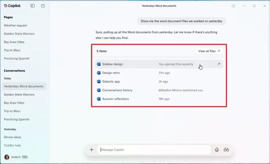 Nun geben Sie den Dateisuchinhalt mit Copilot ein , z. B. „Zeigen Sie mir die Word-Dokumentdateien, an denen wir gestern gearbeitet haben“, und drücken wie gewohnt auf „Senden“.