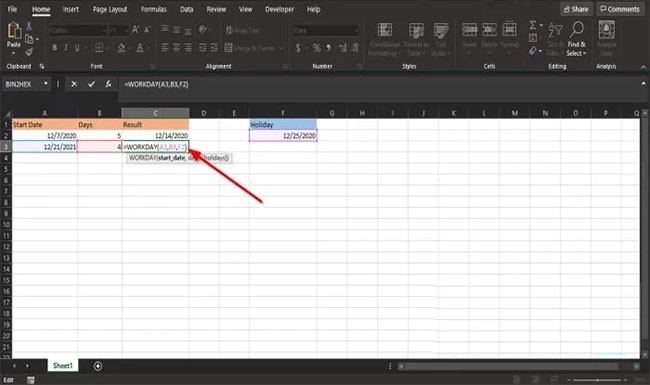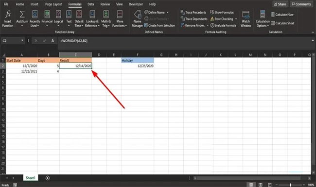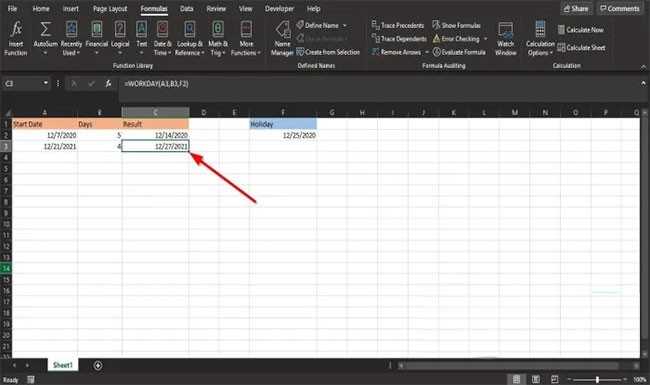 Geben Sie also =WORKDAY(A3, B3, F2) in die Zelle ein.