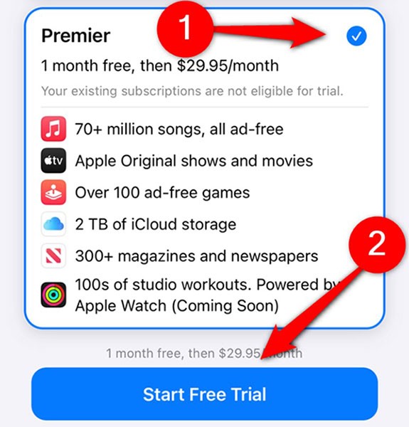 Hinweis : Laut der Website von Apple sparen Sie mit dem Premier-Plan 29 $/Monat im Vergleich zur Zahlung für alle sechs On-Demand-Dienste.